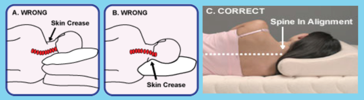 The correct way to sleep is without a crease in your neck. This will help to prevent neck pain. The spine in your upper back remains level with the cervical spine in your neck for ideal support. There is no skin crease and the pillow is tucked into the shoulder to maintain natural spine alignment.